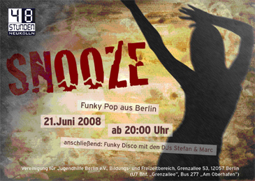 48 Stunden Neukölln. Vom 20. bis 22. Juni 2008 feierte Berlins größtes Kunst- und Kulturfestival sein zehnjähriges Jubiläum. Während der 48 Stunden Neukölln erwarteten die Besucher eine Vielzahl hochklassiger Veranstaltungen rund um das diesjährige Schwerpunktthema "Von Utopien und Glücksmomenten". Zu Glücksmomenten verhalf auch die Musik von "Snooze" mit ihrem "Funky Pop". Am 21. Juni 2008 um 20:00 Uhr trat die Berliner Band im neuen Bildungs- und Freizeitbereich der Vereinigung für Jugendhilfe (VfJ) in der Grenzallee auf. Die VfJ beteiligte sich erstmals an dem Festival. Funky Pop, das ist eine Kombination aus eingängigen Melodien mit rhythmischen Elementen aus Funk, Blues und Soul - dynamisch und abwechslungsreich interpretiert. Die deutschen und englischen Texte stammen aus eigener Feder und beschäftigen sich mit alltäglichen Lebenssituationen und der Liebe. Musik, garantiert mit Ohrwurmcharakter. Interessant, charmant und gekonnt interpretiert. Zum Zuhören, Bewegen und für ein glückliches Lächeln. Zu Glücksmomenten verhelfen auch Kinder. Guido Jankowski, einer der Gitarristen von "Snooze", arbeitet als Erzieher im Integrationskindergarten der Einrichtung in der Parchimer Allee.