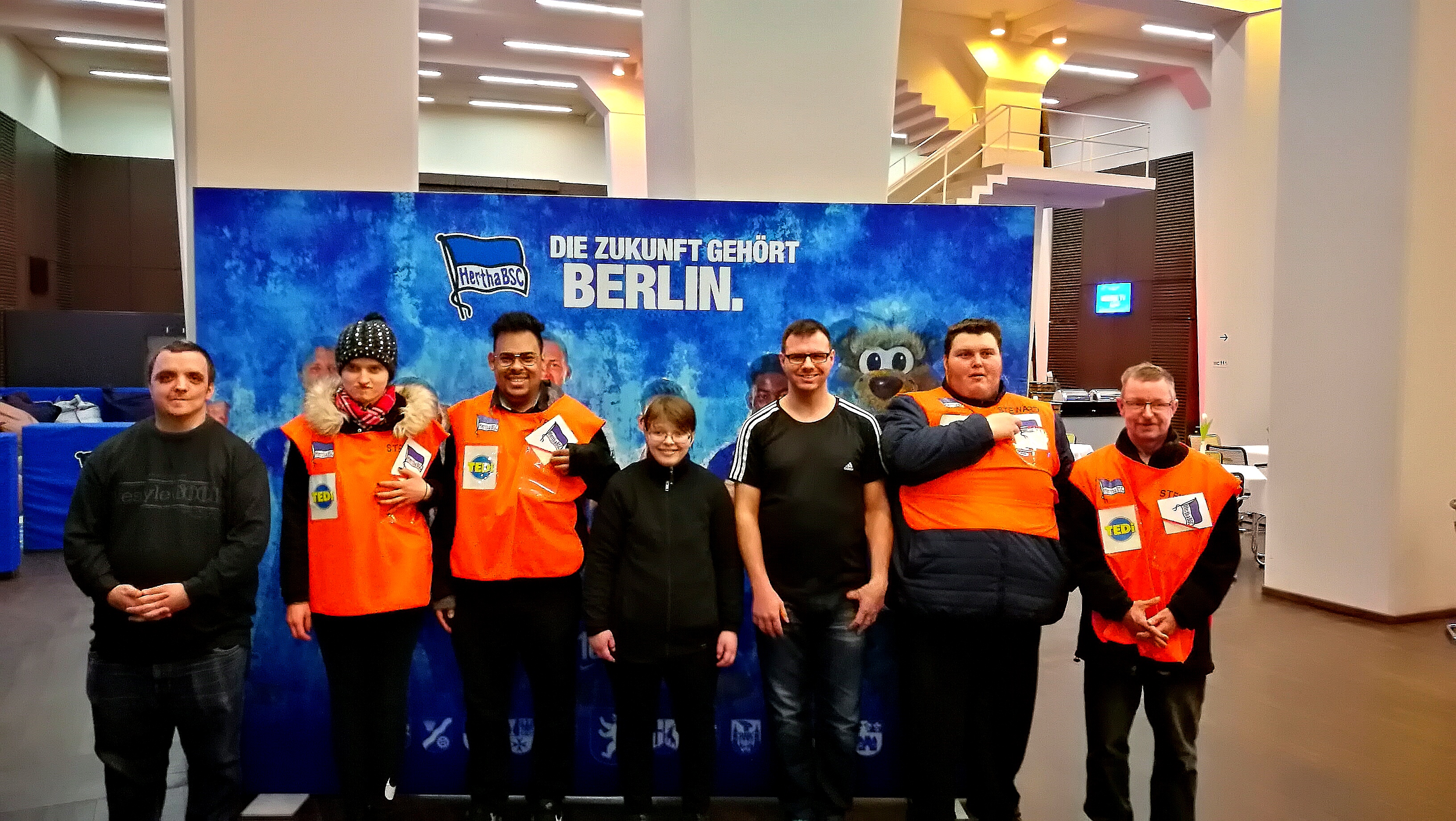 Für acht Mitarbeiter und zwei Gruppenleiter der VfJ Werkstätten gab es am Samstag, den 8. Februar bei Hertha BSC : SFV Mainz einen tollen Schichtwechsel-Nachschlag: Mitarbeit bei der Einlasskontrolle und im VIP-Bereich in der ersten Halbzeit. Mitfiebern und Daumendrücken auf der Tribüne in der zweiten Halbzeit.